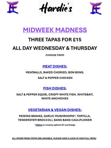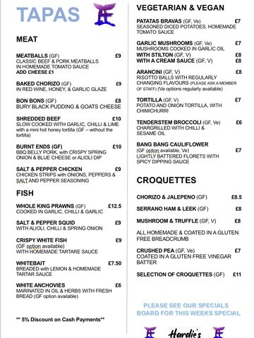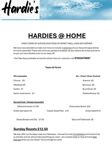 We also do Hardies @ Home. This is a glorious taste of our tapas that you can enjoy anytime! Simple order - collect and heat / assemble at home - Perfect